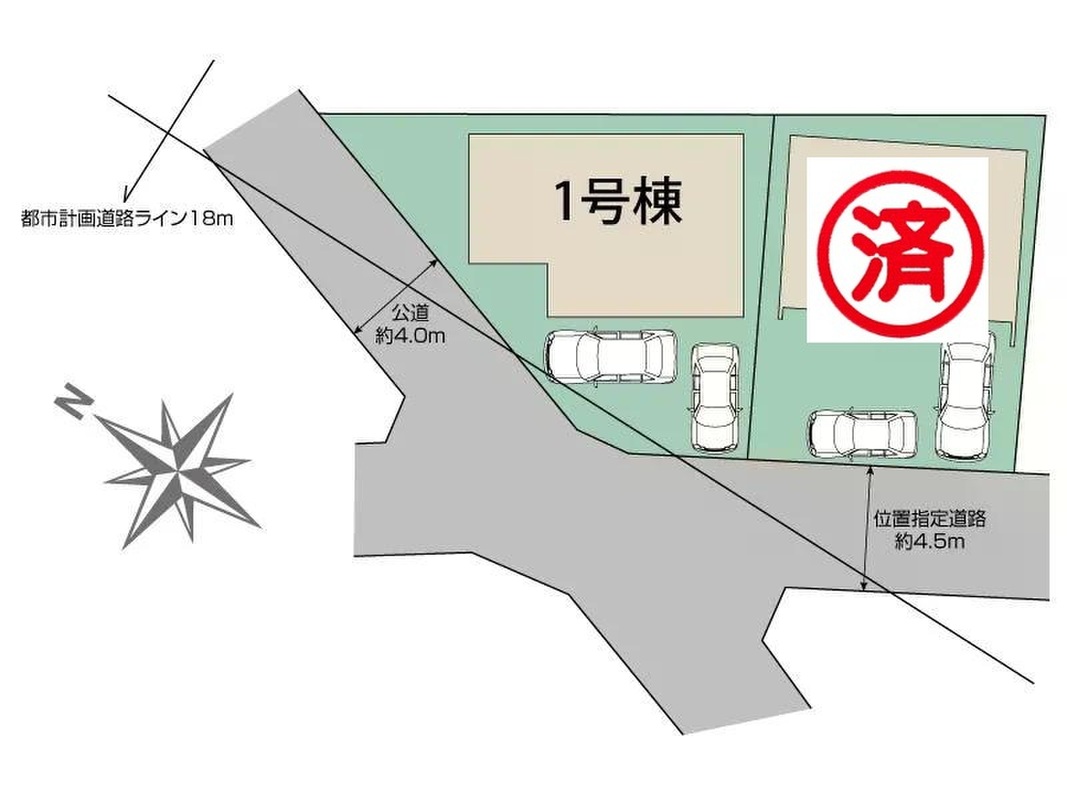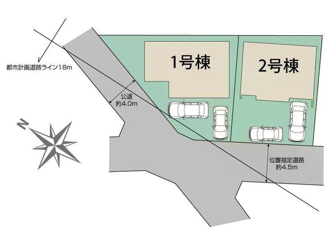 | 駐車場 | 2台 | 道路の幅員 | 道路幅:4m~4.5m、アスファルト舗装、西4.0m公道(SB後)、南西4.5m位置指定道路 |