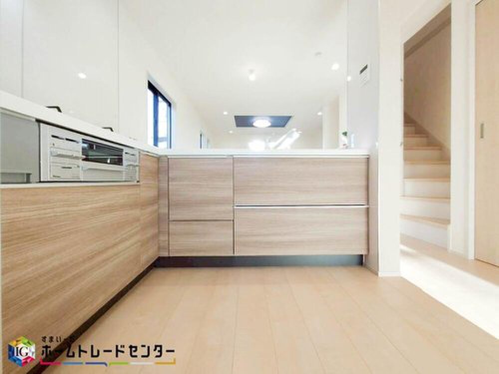 対面式キッチンは家族との大事なコミュニケーションも取りやすく自然と会話が増えるような設計となっています。床下の収納スペースもちょっとした物を収納できるので嬉しい魅力♪