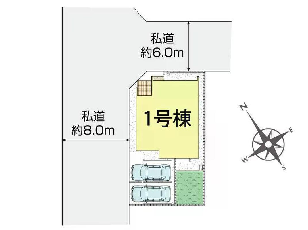 | 駐車場 | 2台 | 道路の幅員 | 道路幅:6m~8m、アスファルト舗装、北東6.0m私道、北西8.0m私道 |
