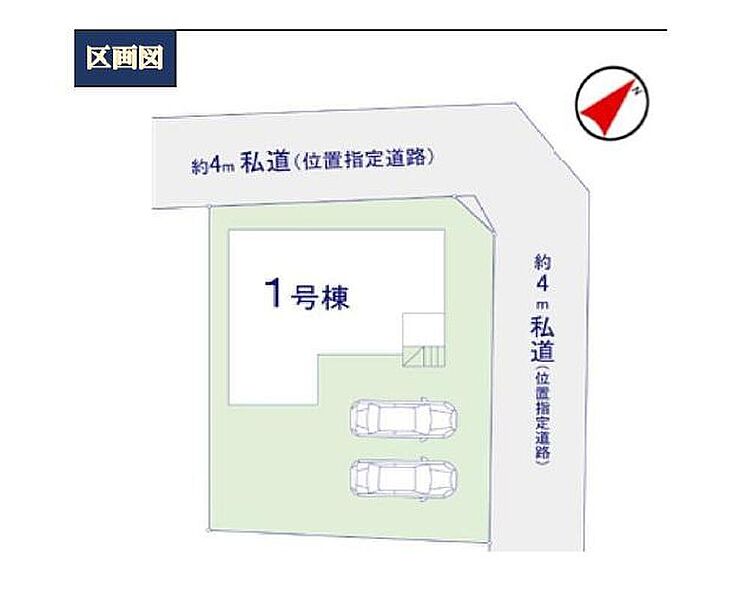 | 駐車場 | 2台 | 道路の幅員 | 道路幅:4m、アスファルト舗装、角地 : 北東 4m 私道、北西 4m 私道 |