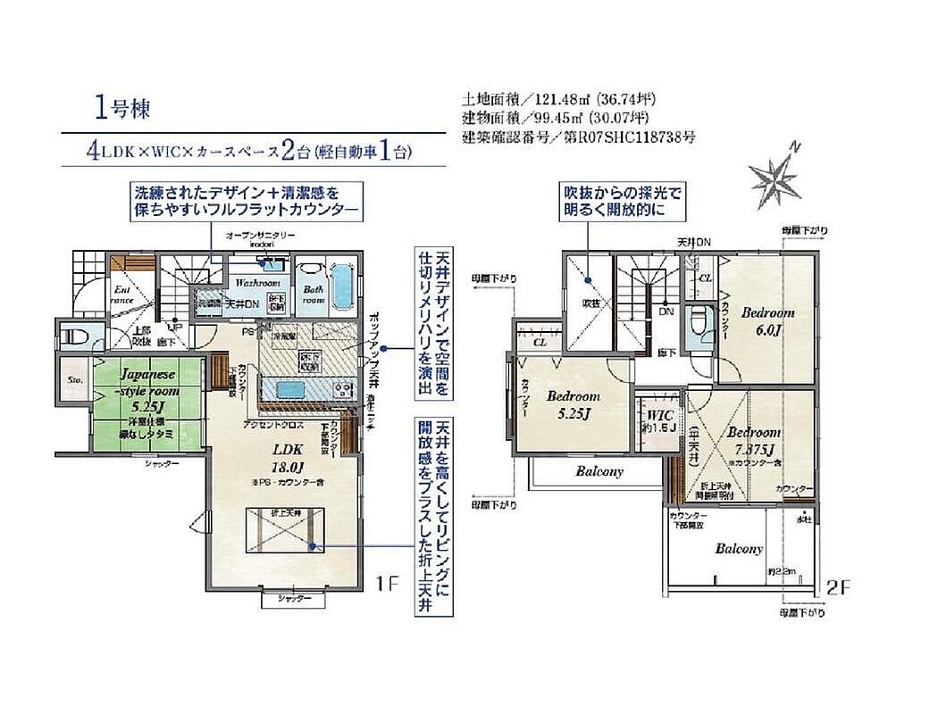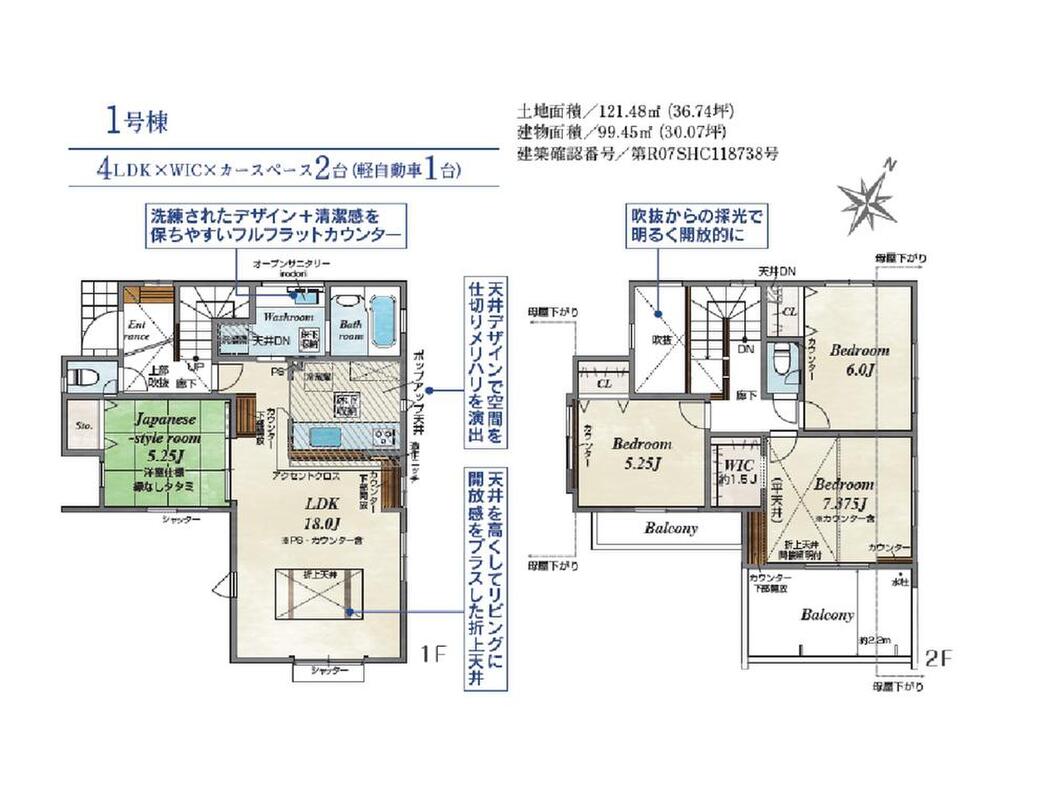 | 建物面積 | 99.39m2・99.45m2 | 土地面積 | 121.48m2・121.69m2 |