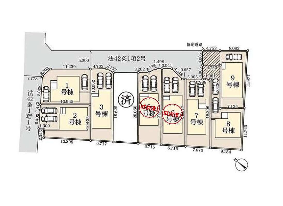 | 駐車場 | 1台 ~ 2台(1台(9号棟)・2台(1号棟・2号棟・3号棟・7号棟・8号棟)) | 道路の幅員 | 道路幅:5m~7.7m、アスファルト舗装、北東側5m私道 |