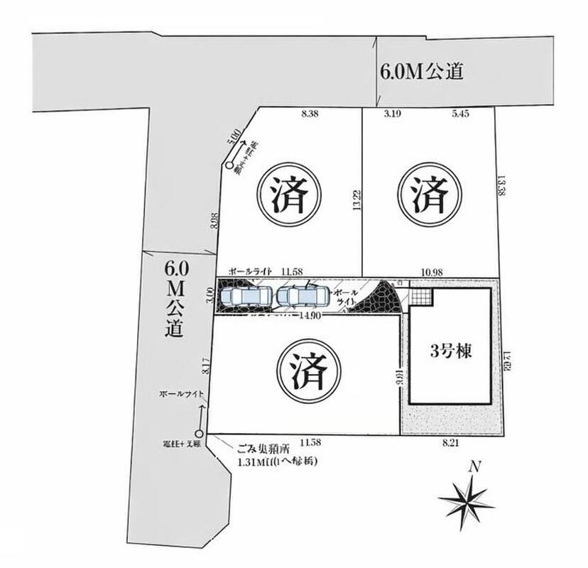 | 駐車場 | 2台 | 道路の幅員 | 道路幅:6m、アスファルト舗装、西側6.0m |