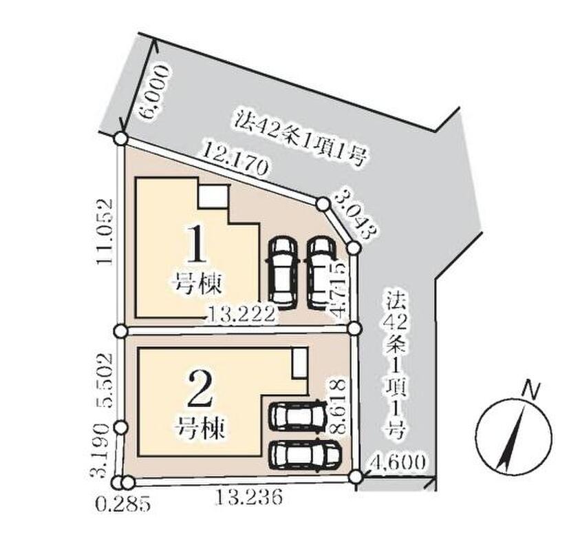 | 駐車場 | 2台(車種による) | 道路の幅員 | 道路幅:4.6m・6m、アスファルト舗装、東側4.6m公道、北東側6.0m公道 |