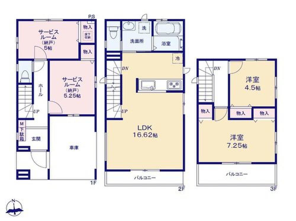 | 間取り | 2LDK+2S(納戸) | 建物構造 | 木造サイディング貼アスファルトシングル葺3階建て |