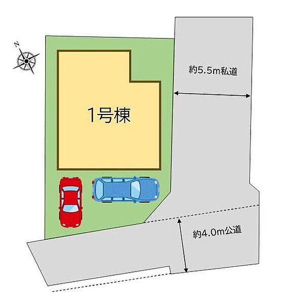 | 駐車場 | 2台 | 道路の幅員 | 道路幅:4m~5.5m、アスファルト舗装、角地 : 南東 5.5m 私道、南西 4m 公道 |