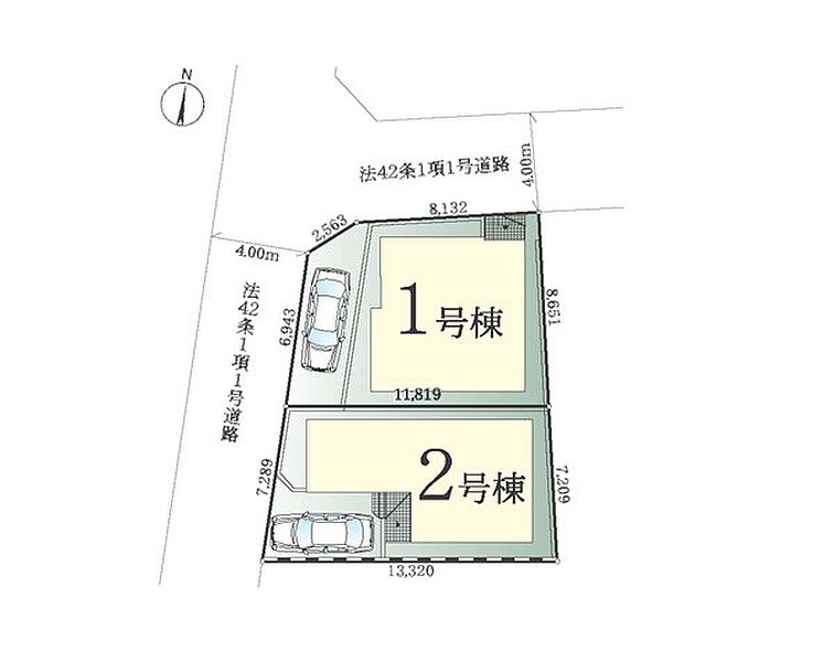| 駐車場 | 1台 | 道路の幅員 | 2号棟:西4m |