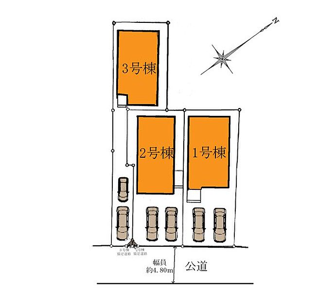 | 駐車場 | 2台 | 道路の幅員 | 2号棟:東4.8m /3号棟:東4.8m /1号棟:東4.8m |