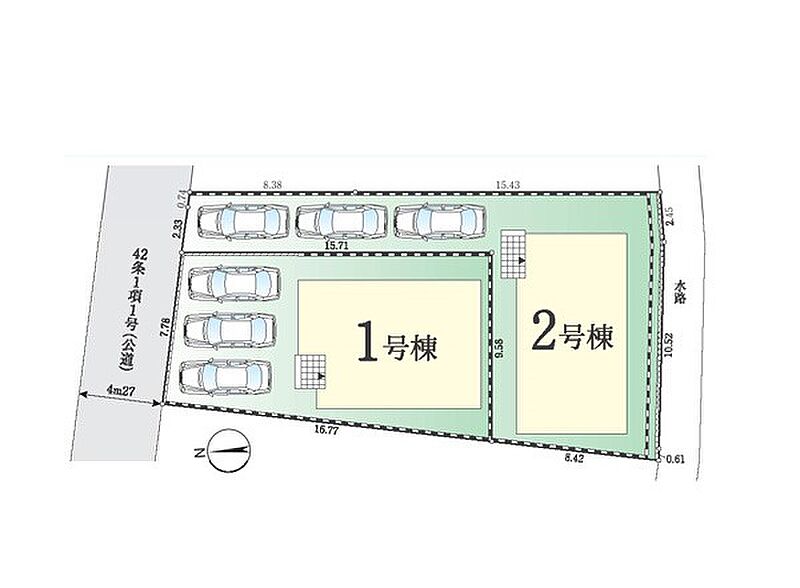 | 駐車場 | 3台 | 道路の幅員 | 1号棟:北4.2m |