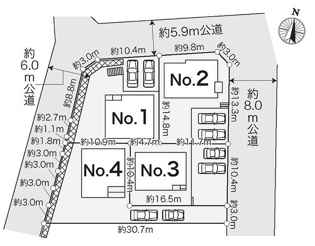| 駐車場 | 2台 | 道路の幅員 | 1号棟:北5.9m 西6m |
