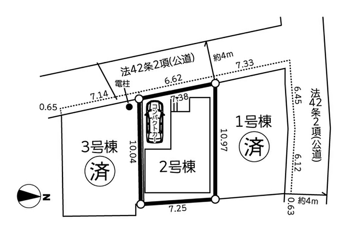 | 駐車場 | 1台 | 道路の幅員 | 2号棟:西4m |