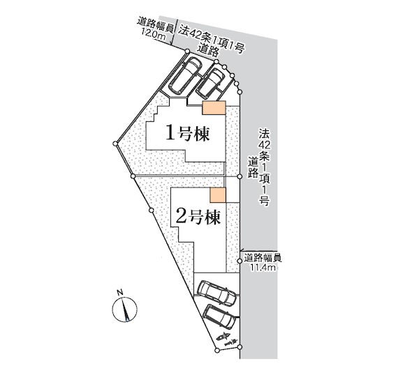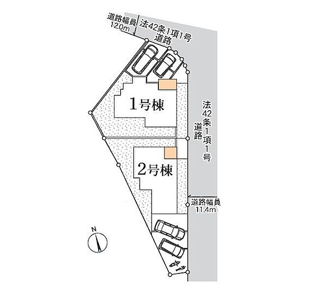 | 駐車場 | 2台 | 道路の幅員 | 2号棟:南東12m /1号棟:北12m 東11.4m |