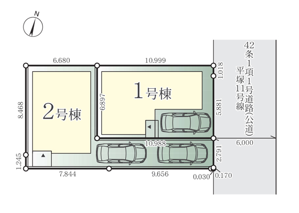 | 駐車場 | 1台 | 道路の幅員 | 1号棟:北東6m |