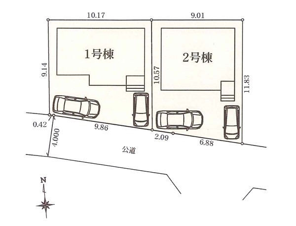 | 駐車場 | 2台 | 道路の幅員 | 1号棟:南4m |
