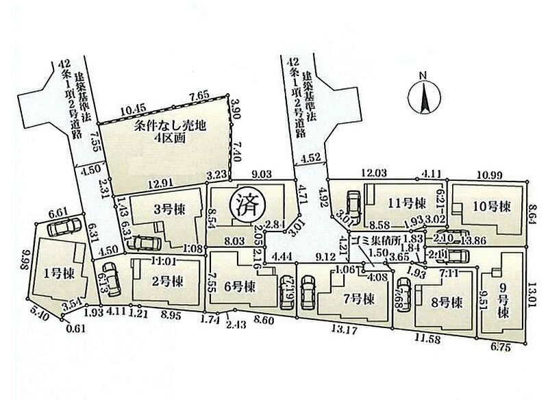 | 駐車場 | 1台 | 道路の幅員 | 6号棟:北4.5m /3号棟:西4.5m /8号棟:東4.2m /11号棟:南4.2m /2号棟:北4.5m /1号棟:東4.5m /7号棟:東4.5m |