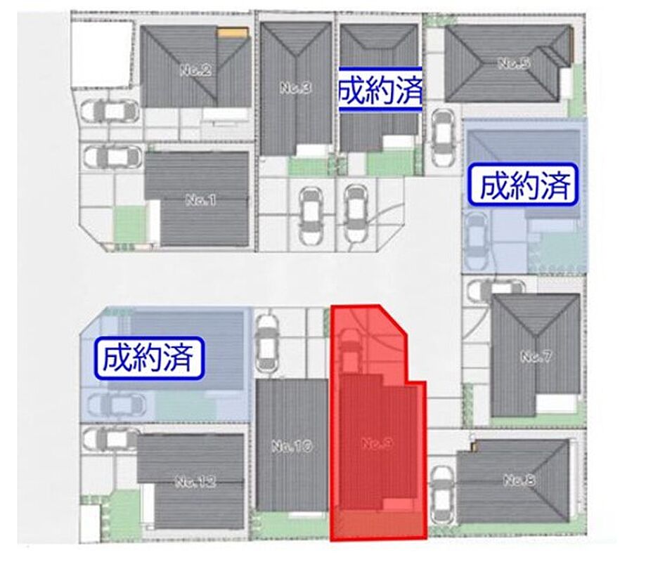 | 駐車場 | 2台 | 道路の幅員 | 9号棟:北4.5m /12号棟:北4.5m /10号棟:北4.5m |