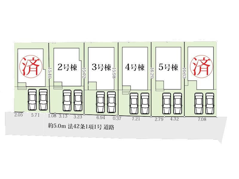 | 駐車場 | 2台 | 道路の幅員 | 2号棟:南5m |