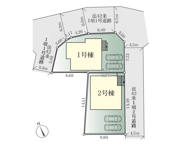 | 駐車場 | 2台 | 道路の幅員 | 1号棟:北6.1m 西4.4m 東4.5m |