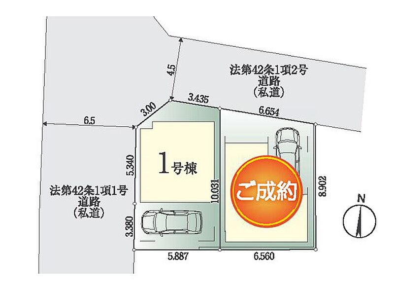 | 駐車場 | 1台 | 道路の幅員 | 1号棟:北4.5m 西6.5m |