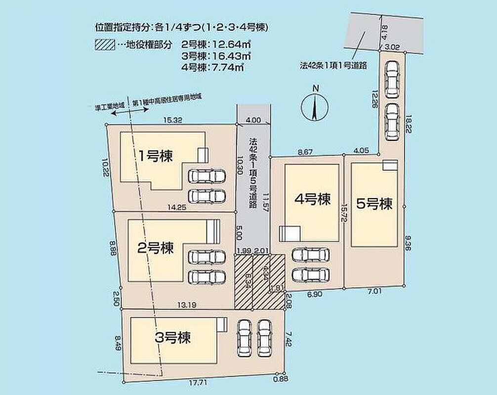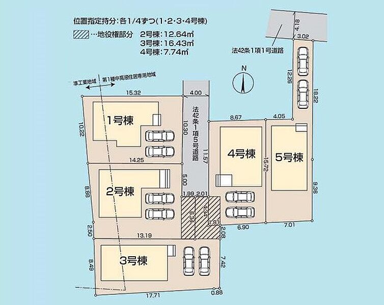 | 駐車場 | 2台 | 道路の幅員 | 2号棟:東4m /4号棟:西4m /3号棟:北4m /5号棟:北4m /1号棟:東4m |
