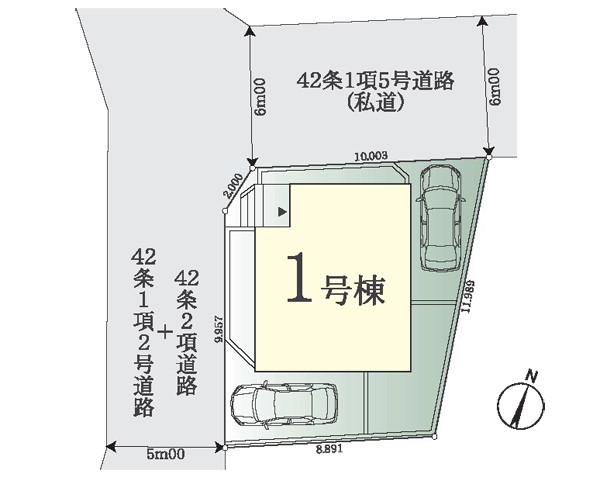| 駐車場 | 2台 | 道路の幅員 | 1号棟:北6m 西5m |