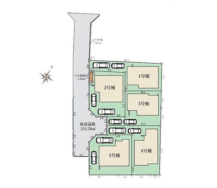 | 駐車場 | 2台 | 道路の幅員 | 5号棟:西4.5m /1号棟:西4.5m |