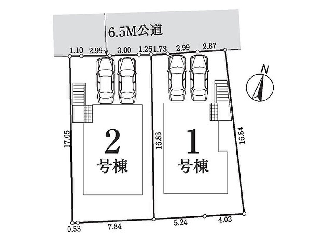 | 駐車場 | 2台 | 道路の幅員 | 1号棟:北6.5m /2号棟:北6.5m |