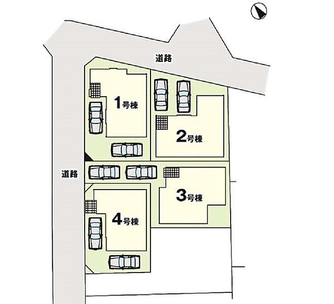 | 駐車場 | 2台 | 道路の幅員 | 1号棟:北西4.5m 北東4m /3号棟:北西4.5m /4号棟:北西4.5m /2号棟:北東4m |