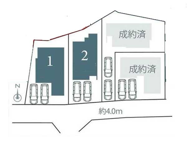 | 駐車場 | 2台 | 道路の幅員 | 1号棟:南4m /2号棟:南4m |