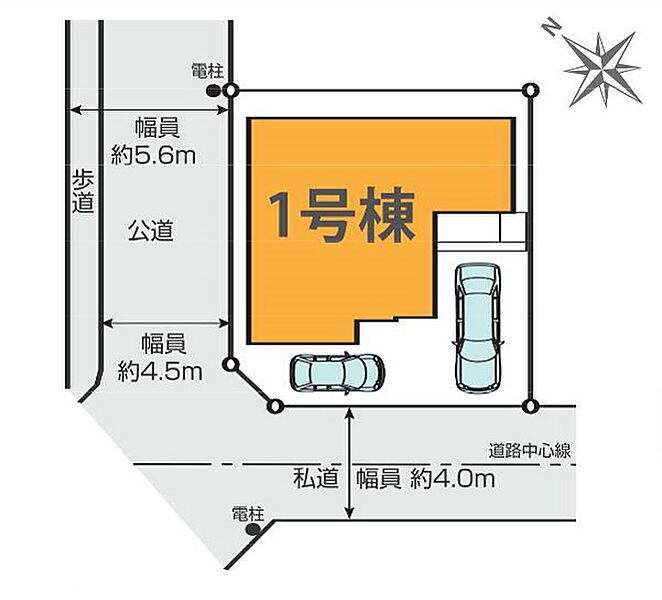 | 駐車場 | 2台 | 道路の幅員 | :北西5.6m 南西4m |