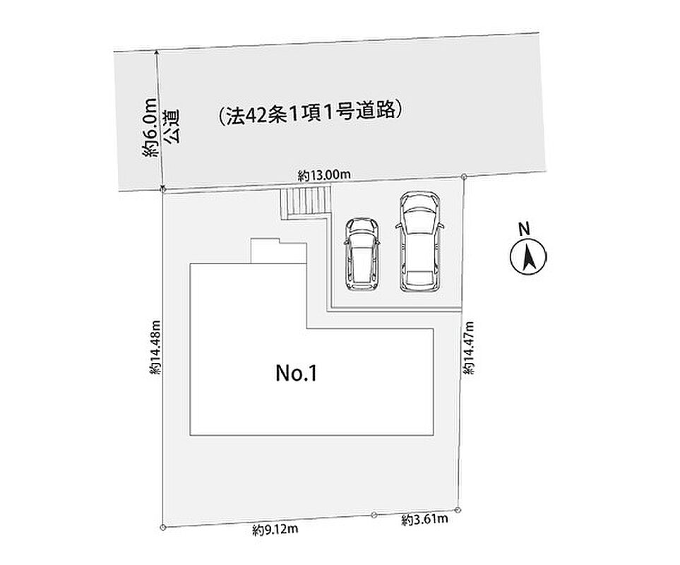 | 駐車場 | 2台 | 道路の幅員 | 1号棟:北6m |