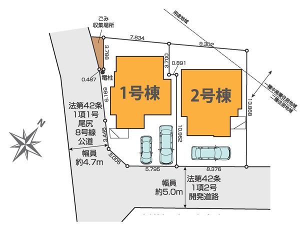 | 駐車場 | 2台 | 道路の幅員 | 1号棟:南東5m 南西4.7m |