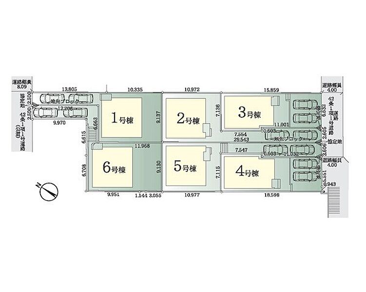 | 駐車場 | 2台 | 道路の幅員 | 3号棟:南東4m /6号棟:北西8m /5号棟:南東4m /1号棟:北西8m /2号棟:南東4m /4号棟:南東4m |