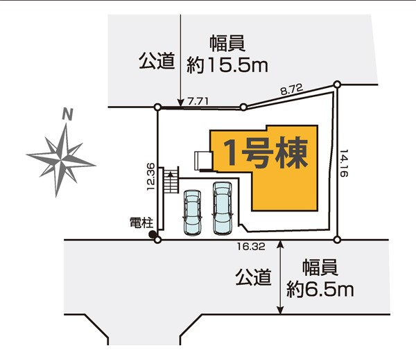 | 駐車場 | 2台 | 道路の幅員 | 1号棟:南6.5m 北15.5m |