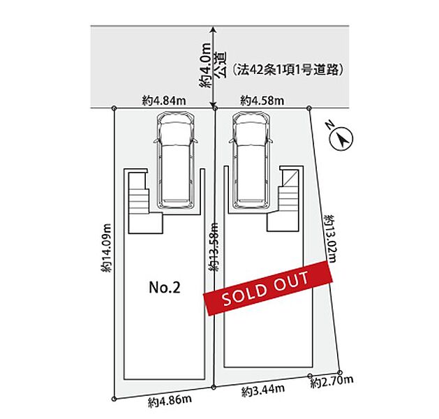 | 駐車場 | 1台 | 道路の幅員 | 2号棟:北西4m |