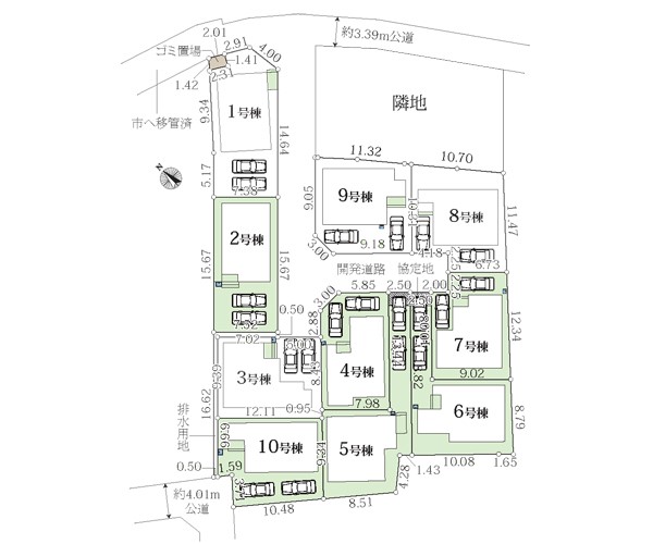 | 駐車場 | 2台 | 道路の幅員 | 4号棟:北東4.5m /2号棟:南東4.5m /7号棟:北4.5m /1号棟:南東4.5m 北東4m /10号棟:南西4m /5号棟:北東4.5m |