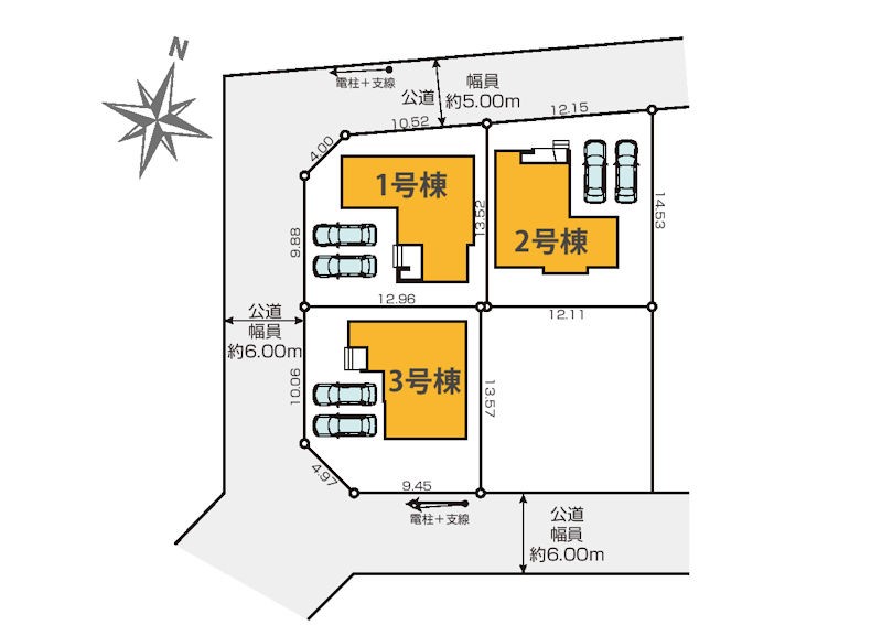 | 駐車場 | 2台 | 道路の幅員 | 2号棟:北5m /1号棟:北5m 西6m /3号棟:西6m 南5.9m |