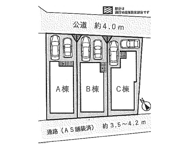 | 駐車場 | 2台 | 道路の幅員 | C棟:北東4m 南西3.5m /A棟:北東4m 南西3.5m /B棟:北東4m 南西3.5m |