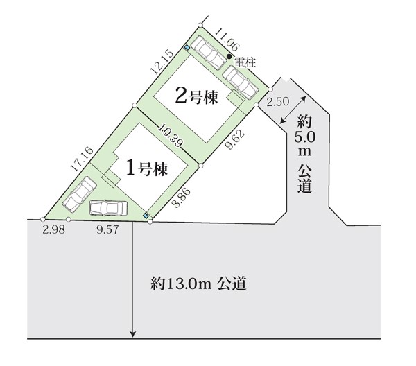 | 駐車場 | 2台 | 道路の幅員 | 1号棟:南東13m /2号棟:北東5m |