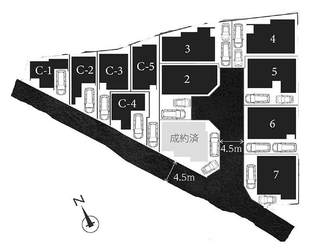| 駐車場 | 1台 | 道路の幅員 | C~5号棟:南西4.5m /C~1号棟:南西4.5m /C~3号棟:南西4.5m /C~4号棟:南西4.5m |