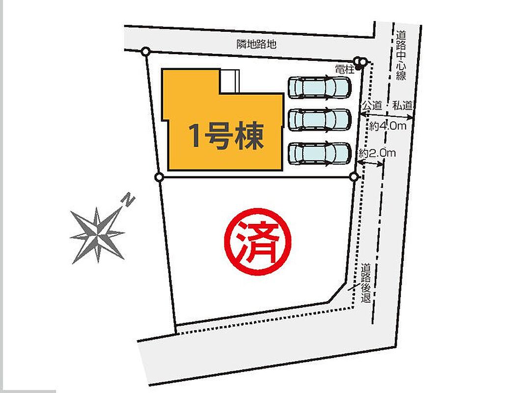 | 駐車場 | 3台 | 道路の幅員 | 1号棟:北東4m |