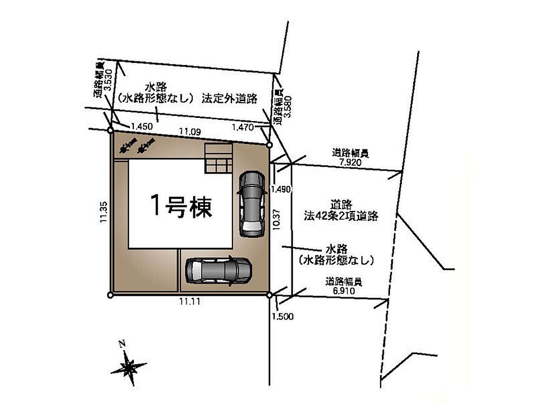| 駐車場 | 2台 | 道路の幅員 | 1号棟:南東6.9m |