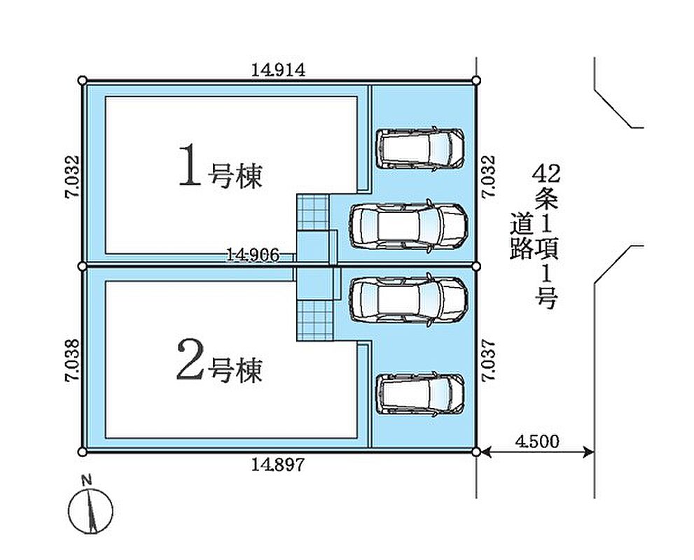 | 駐車場 | 2台 | 道路の幅員 | 1号棟:東4.5m /2号棟:東4.5m |