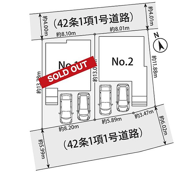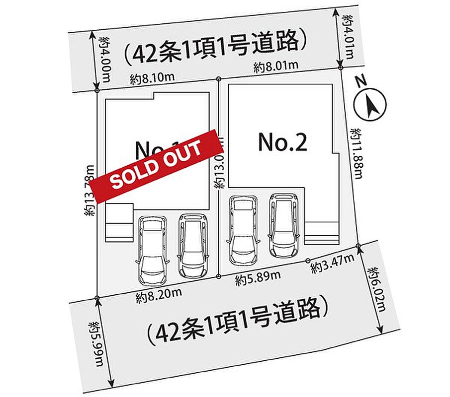 | 駐車場 | 2台 | 道路の幅員 | 2号棟:北4m 南5.9m |