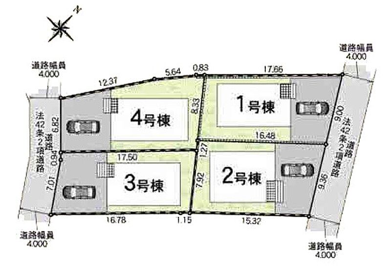 | 駐車場 | 1台 | 道路の幅員 | 1号棟:北東4m /4号棟:南西4m /2号棟:北東4m /3号棟:南西4m |