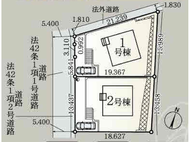 | 駐車場 | 1台 | 道路の幅員 | 2号棟:西5.4m /1号棟:西5.4m |