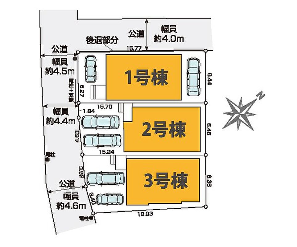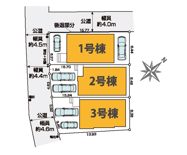 | 駐車場 | 2台 | 道路の幅員 | 1号棟:南西4.4m 北西4m /2号棟:南西4.4m /3号棟:南西4.4m |
