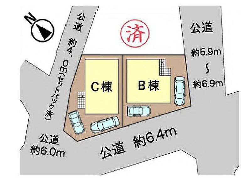 | 駐車場 | 2台 | 道路の幅員 | C棟:南西6.4m 北4m /B棟:南西6.4m 南東5.9m |
