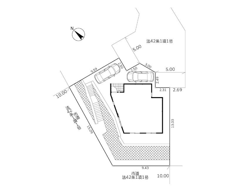 | 駐車場 | 2台 | 道路の幅員 | 1号棟:東5m |