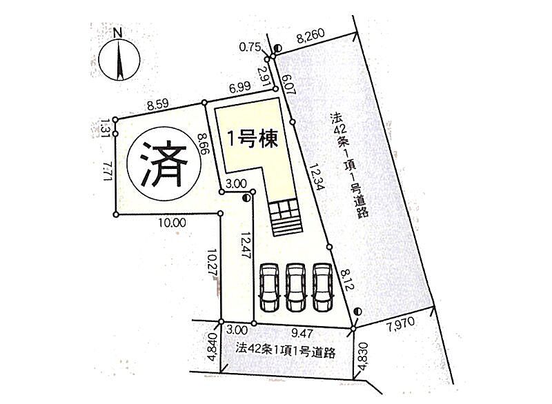 | 駐車場 | 3台 | 道路の幅員 | 1号棟:東7.9m 南4.8m |
